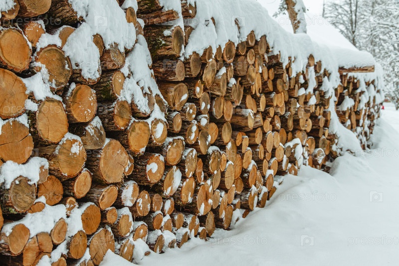 Куча бревен спиленных деревьев, собранных вместе, лежала под снегом. Делаем дрова на зиму