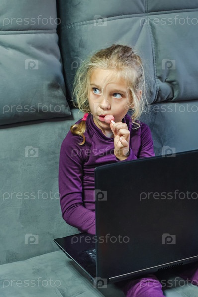 Блондинка с леденцом в руке сидит со своим ноутбуком на сером диване. Задумчивый взгляд ребенка направлен в сторону. Концепция дистанционного обучения
