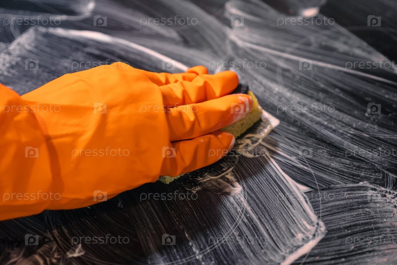 Крупный план оранжевой перчатки, губка для мытья плиты. Выборочный фокус. Концепция домашней чистки электрической плиты