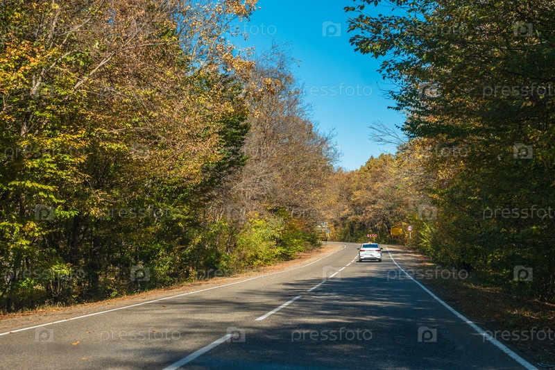 Белая кабина на пустынной проселочной дороге. Желто-зеленый лес по обочинам дороги. Голубое небо на заднем плане