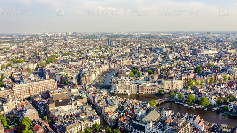 Амстердам, Нидерланды. Летать над крышами города. Историческая часть города с городскими судоходными каналами, вид с воздуха