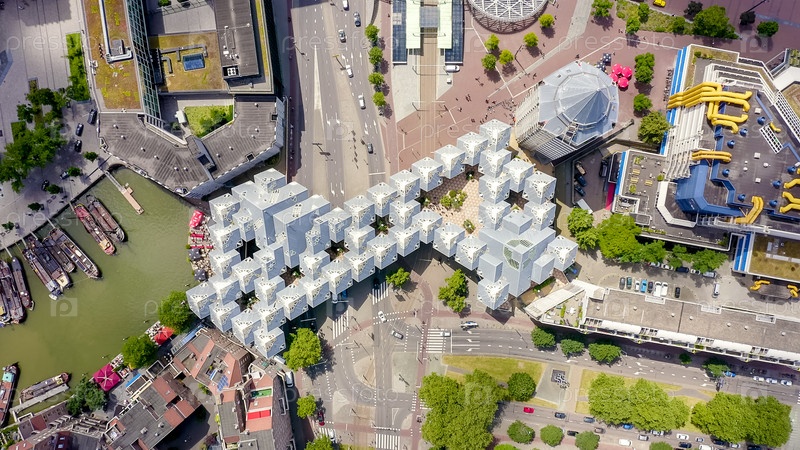 Роттердам, Нидерланды. Панорама деловой части города. Кубические дома сверху, вид с воздуха, СНИМОК ГОЛОВЫ
