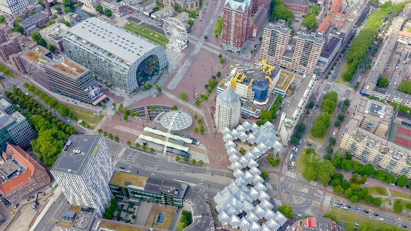 Роттердам, Нидерланды. Панорама деловой части города. Облачная погода. Кубические дома, Вид с воздуха