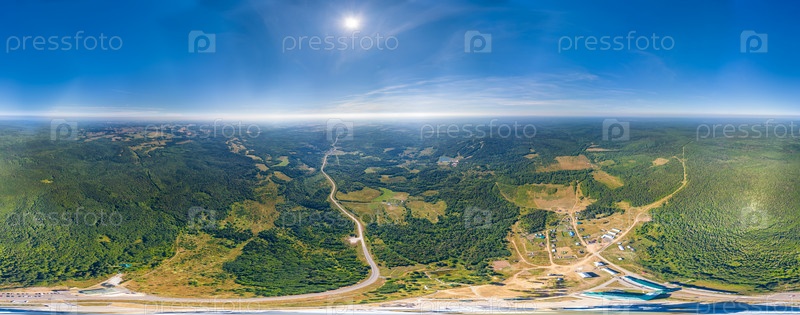 Россия, Пермский край. Белогорский Свято-Николаевский миссионерский монастырь. Крестовоздвиженский собор Белогорского Николаевского монастыря. С высоты птичьего полета. Панорама 360