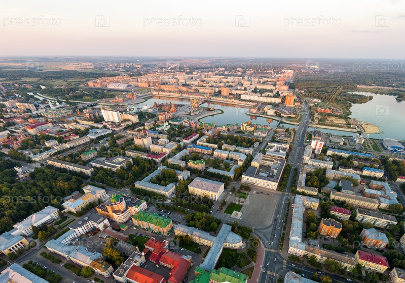 Йошкар-Ола, Россия. Панорама центра города во время заката. С высоты птичьего полета