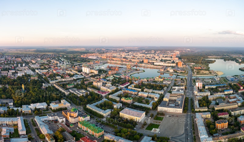 Йошкар-Ола, Россия. Панорама центра города во время заката. С высоты птичьего полета