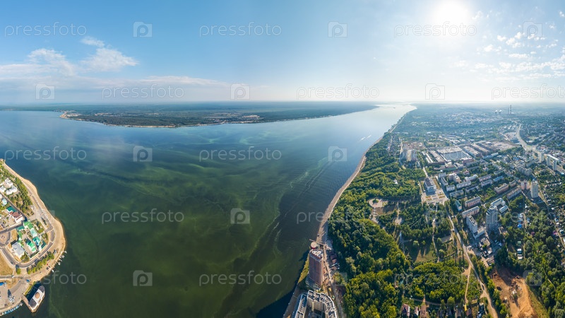 Чебоксары, Россия. Панорама города с воздуха. река Волга. Солнечный день. С высоты птичьего полета