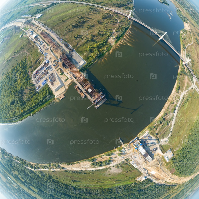 Муром, Россия. Муромский мост. Строительство моста через реку Оку. Строительная площадка трассы М12 Москва - Казань. С высоты птичьего полета