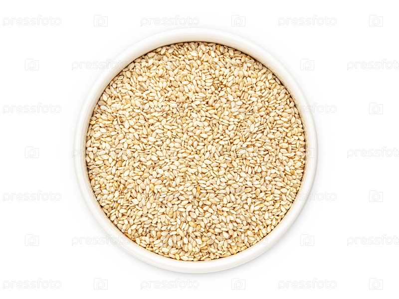 Белый кунжут в белой миске на белом фоне, изолировать, крупный план, вид сверху. Плоская планировка