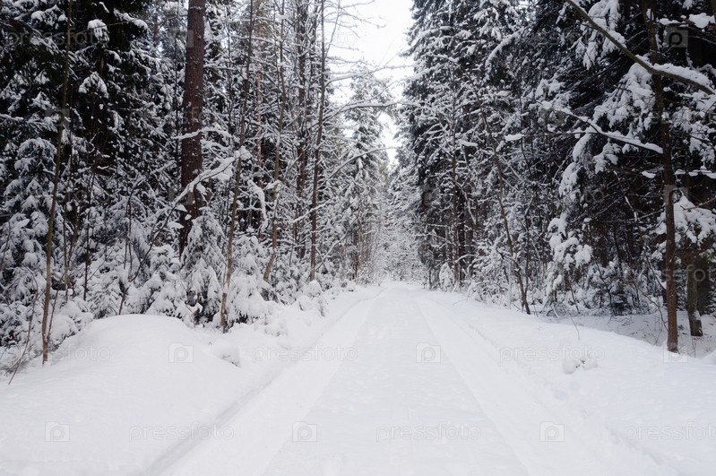 Дорога в зимнем лесу. Деревья под снегом зимой