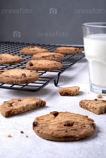 Запеченное овсяное печенье с шоколадной крошкой на металлической охлаждающей стойке и молоком в стакане