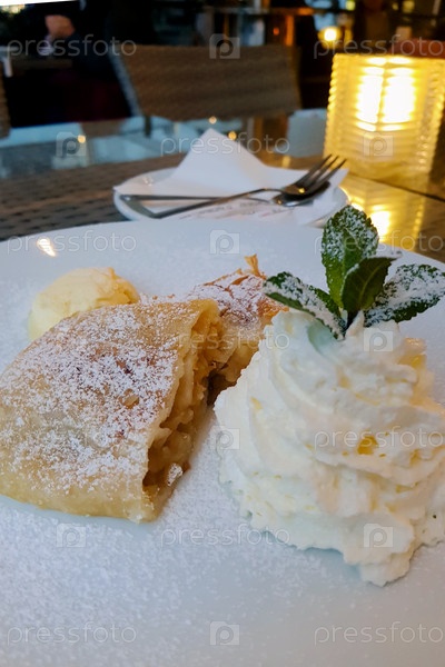 Яблочный штрудель с мороженым и взбитыми сливками крупным планом