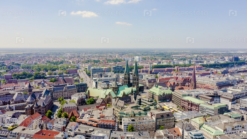 Бремен, Германия. Историческая часть Бремена, старый город. Бременский собор (Св. Петри, Бремен). Вид в полете, вид с воздуха
