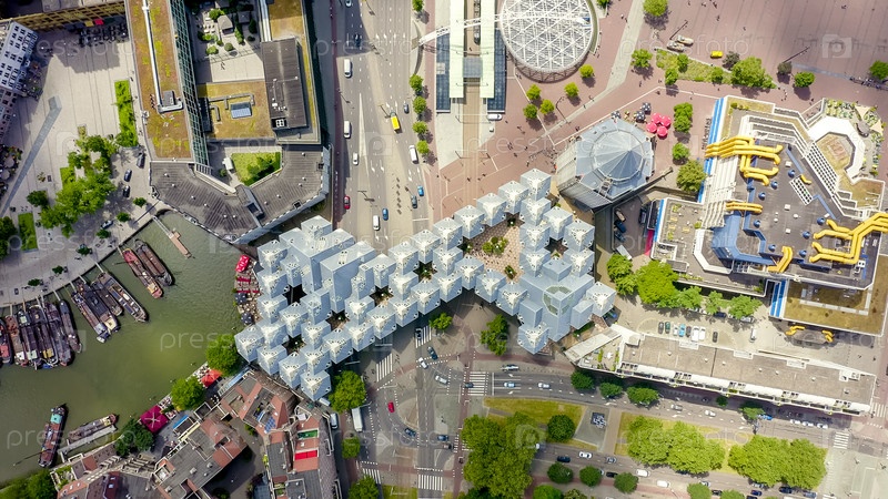 Роттердам, Нидерланды. Панорама деловой части города. Кубические дома сверху, вид с воздуха, СНИМОК ГОЛОВЫ