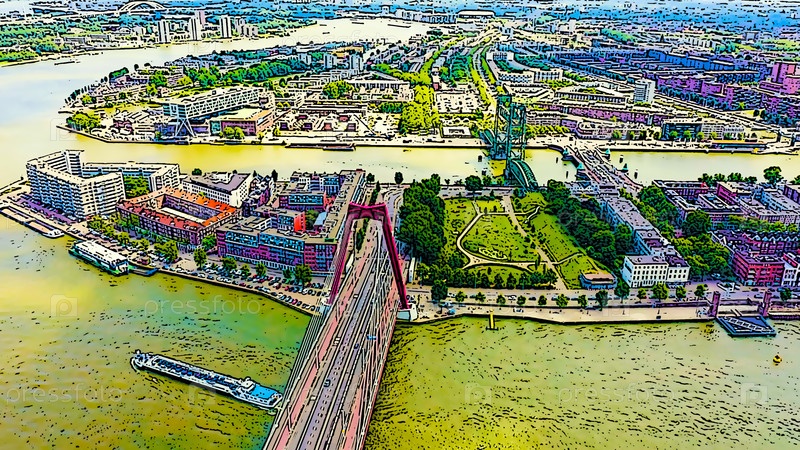 Роттердам, Нидерланды. Висячий мост Вильямсбург через реку Ньиве-Маас, вид с воздуха