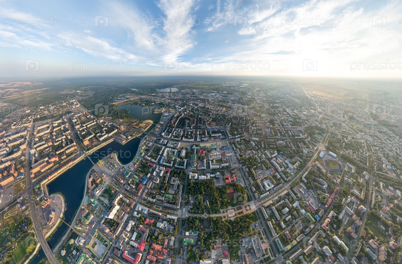 Йошкар-Ола, Россия. Панорама центра города во время заката. С высоты птичьего полета