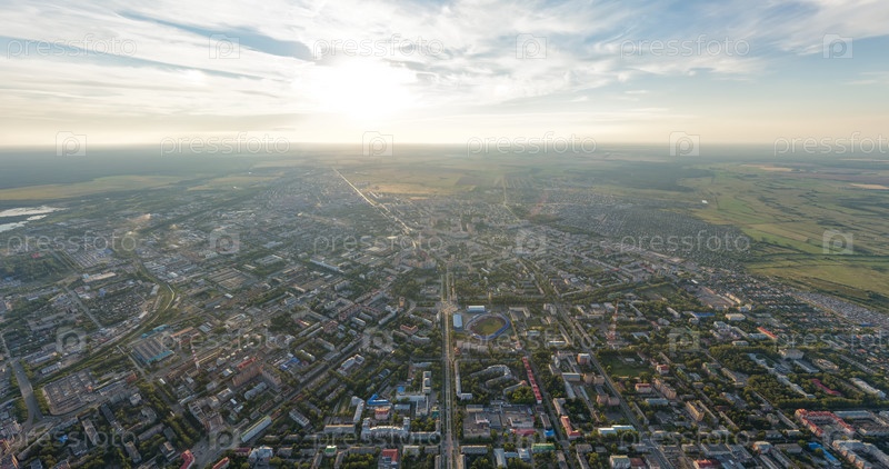 Йошкар-Ола, Россия. Панорама центра города во время заката. С высоты птичьего полета