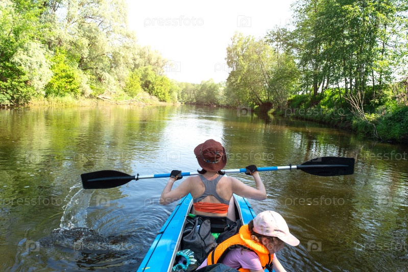 Семейный поход на байдарках. Мама и дочка катаются на лодке по реке, водный поход, летнее приключение. Экологичный и экстремальный туризм, активный и здоровый образ жизни
