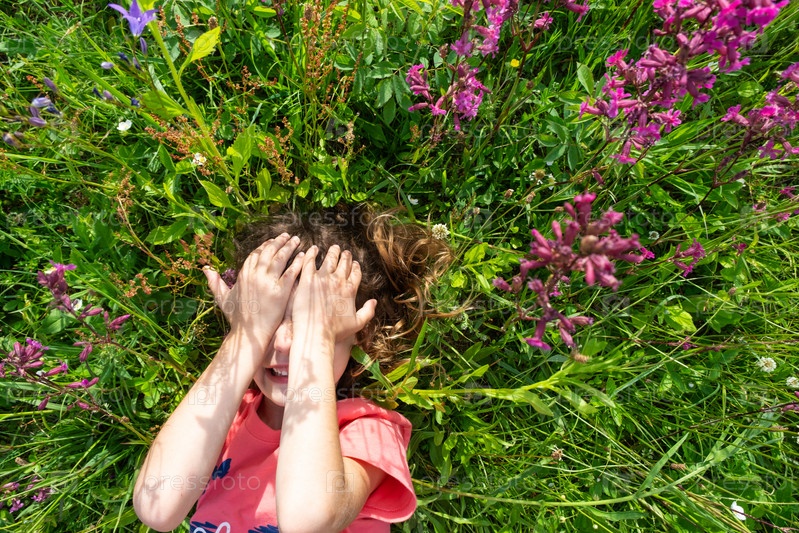 Портрет ребенка в шляпе с закрытым летом лицом, лежащего в траве и полевых цветах