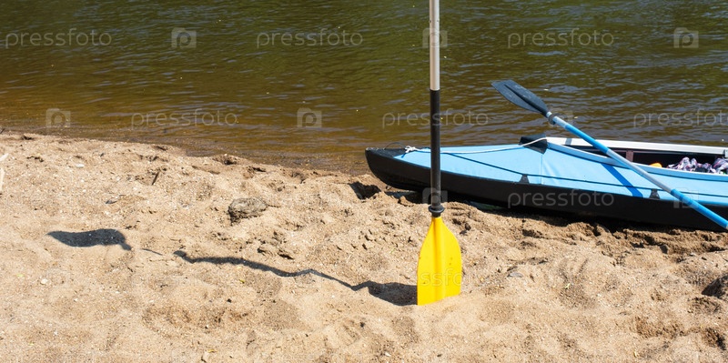 Туристические каноэ с веслами летом стоят на берегу реки во время водного похода. Сплав на надувных и каркасных двухместных и трехместных байдарках, семейный поход, экстремальные приключения летом