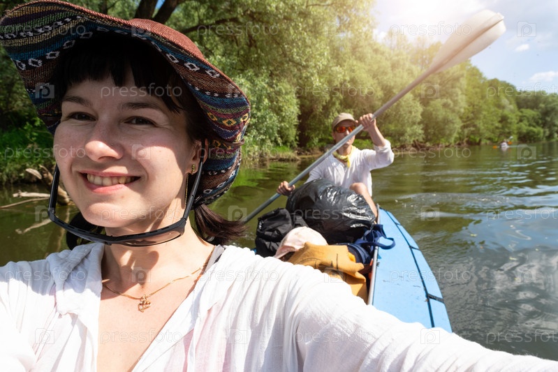 Мужчина и женщина пара, ребенок спит, селфи счастливы в семейном путешествии на байдарках, гребной лодке по реке, водном походе, летних приключениях. Экологичный и экстремальный туризм, активный и здоровый образ жизни