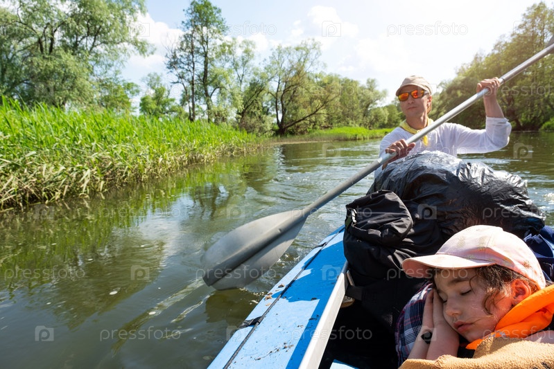 Семейный поход на байдарках. Отец и дочь гребут на лодке по реке, водный поход, летнее приключение. Экологичный и экстремальный туризм, активный и здоровый образ жизни