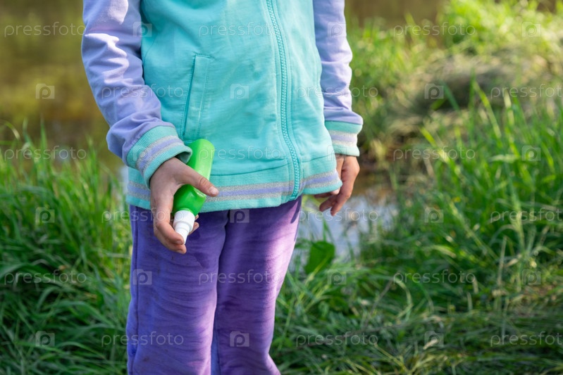 Девушка распыляет спрей от комаров на кожу на природе, которые кусают ее руки и ноги. Защита от укусов насекомых, репеллент безопасен для детей. Отдых на природе, против аллергии. Летнее время