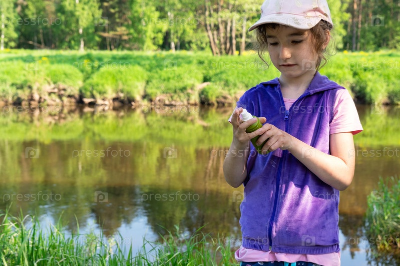Девушка распыляет спрей от комаров на кожу на природе, которые кусают ее руки и ноги. Защита от укусов насекомых, репеллент безопасен для детей. Отдых на природе, против аллергии. Летнее время