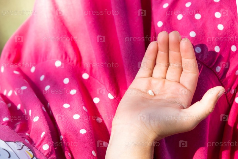 Девушка держит на ладони выпавший молочный зуб. Зубы ребенка меняются на коренные, дошкольный возраст