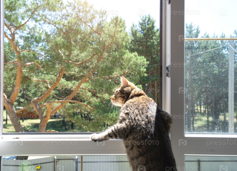 Домашняя кошка смотрит на улицу из окна дома. Прогулка и свежий воздух для питомца, защита от клещей, блох