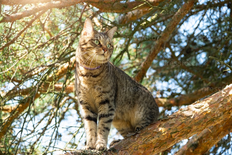 Кошка лазает по веткам дерева. Домашнее животное на прогулке на свежем воздухе. Защита от клещей, блох
