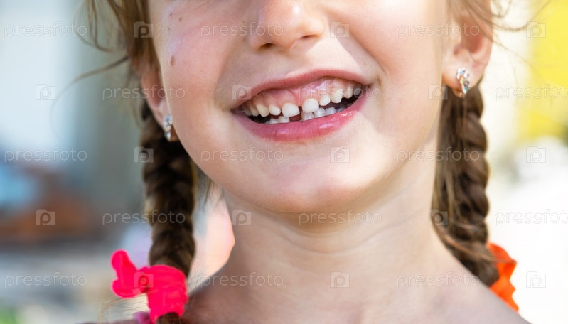 Беззубая счастливая улыбка девушки с выпавшим нижним молочным зубом крупным планом. Смена зубов на моляры в детстве