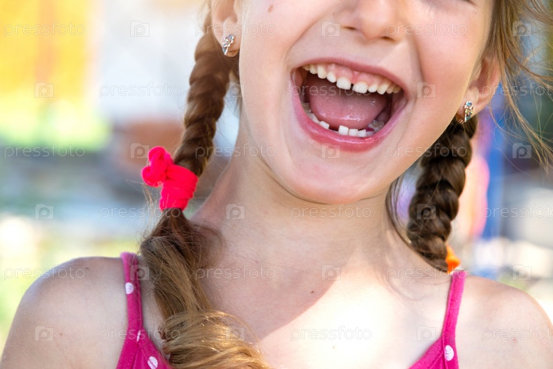 Беззубая счастливая улыбка девушки с выпавшим нижним молочным зубом крупным планом. Смена зубов на моляры в детстве