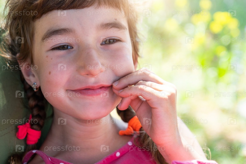 Летний портрет счастливой девочки с задорной и озорной улыбкой крупным планом