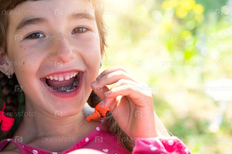 Беззубая счастливая улыбка девушки с выпавшим нижним молочным зубом крупным планом. Смена зубов на моляры в детстве
