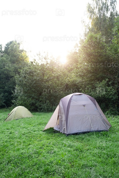 Установлена туристическая палатка в кемпинге на природе в лесу. Внутренний туризм, активный летний отдых, семейные приключения. Экотуризм, спорт, походы. макет