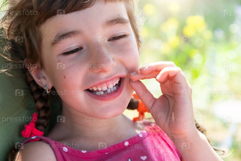Беззубая счастливая улыбка девушки с выпавшим нижним молочным зубом крупным планом. Смена зубов на моляры в детстве
