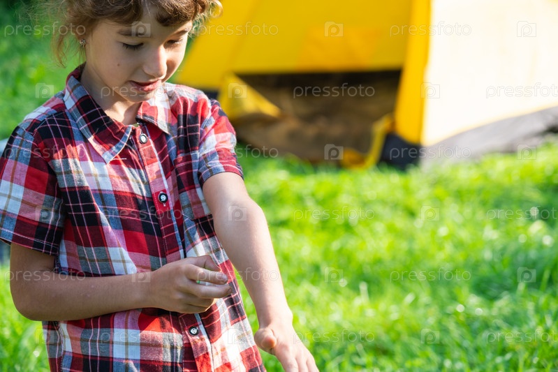 Девушка распыляет спрей от комаров на кожу на природе, которые кусают ее руки и ноги. Защита от укусов насекомых, репеллент безопасен для детей. Отдых на природе, против аллергии. Летнее время