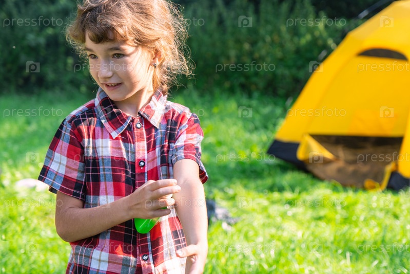 Девушка распыляет спрей от комаров на кожу на природе, которые кусают ее руки и ноги. Защита от укусов насекомых, репеллент безопасен для детей. Отдых на природе, против аллергии. Летнее время