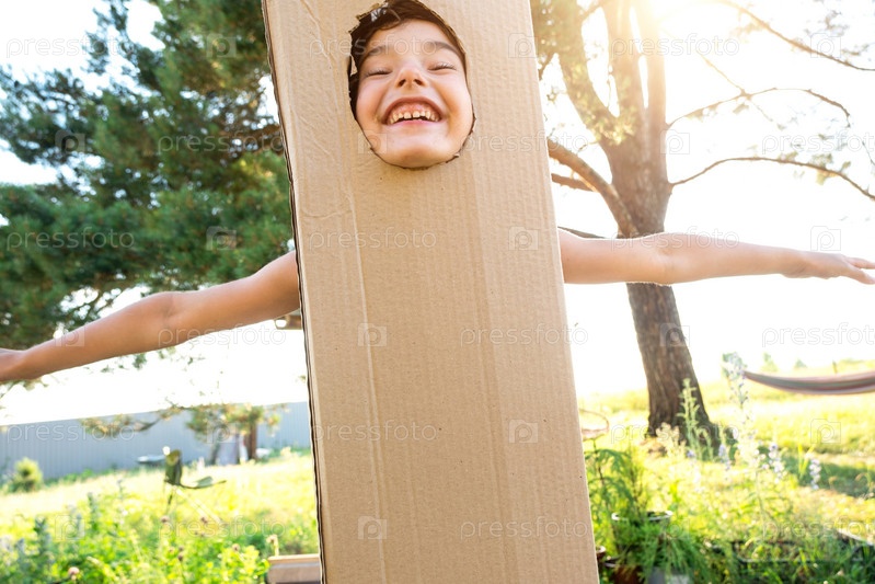Ребенок смешно танцует и дурачится в костюме коробки - круглый вырез для лица и рук. Переезд в новый дом, детские игры из подручных средств, костюм своими руками