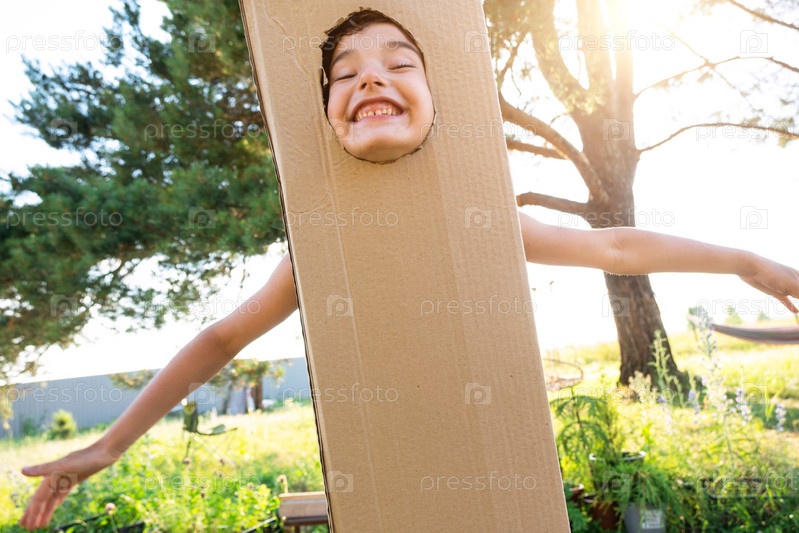 Ребенок смешно танцует и дурачится в костюме коробки - круглый вырез для лица и рук. Переезд в новый дом, детские игры из подручных средств, костюм своими руками