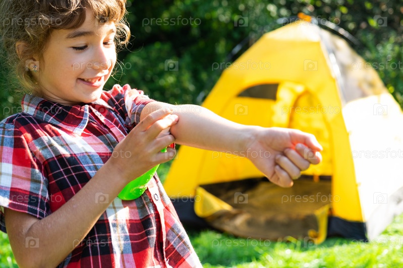 Девушка распыляет спрей от комаров на кожу на природе, которые кусают ее руки и ноги. Защита от укусов насекомых, репеллент безопасен для детей. Отдых на природе, против аллергии. Летнее время