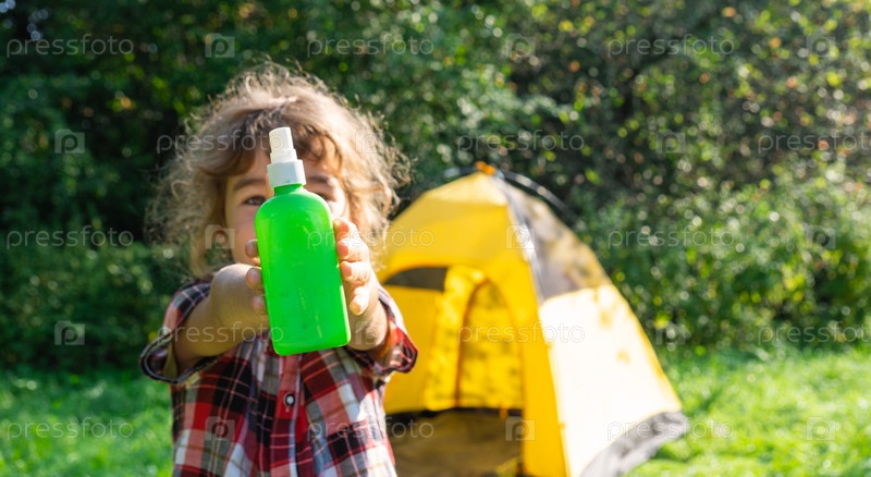 Девушка распыляет спрей от комаров на кожу на природе, которые кусают ее руки и ноги. Защита от укусов насекомых, репеллент безопасен для детей. Отдых на природе, против аллергии. Летнее время