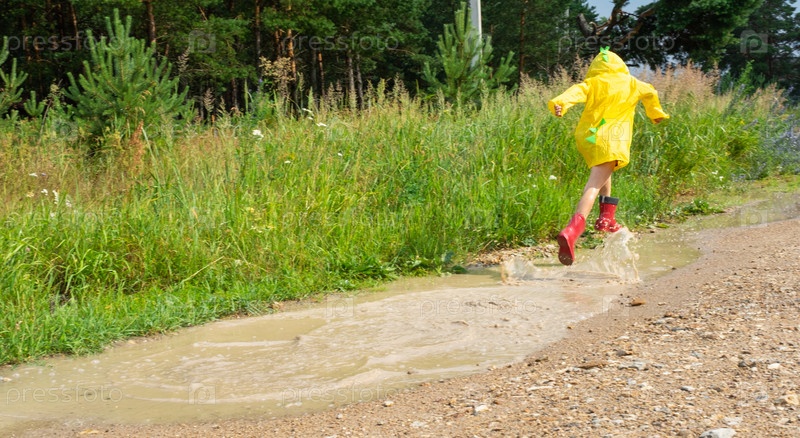 Девушка в красных резиновых сапогах и желтом плаще бежит по лужам после дождя в деревне. Лето, свобода, детство