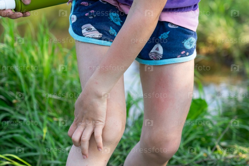 Девушка распыляет спрей от комаров на кожу на природе, которые кусают ее руки и ноги. Защита от укусов насекомых, репеллент безопасен для детей. Отдых на природе, против аллергии. Летнее время