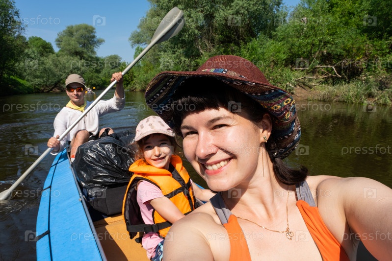 Мужчина и женщина пара, ребенок , селфи счастливы в семейном путешествии на байдарках, гребной лодке по реке, водном походе, летних приключениях. Экологичный и экстремальный туризм, активный и здоровый образ жизни
