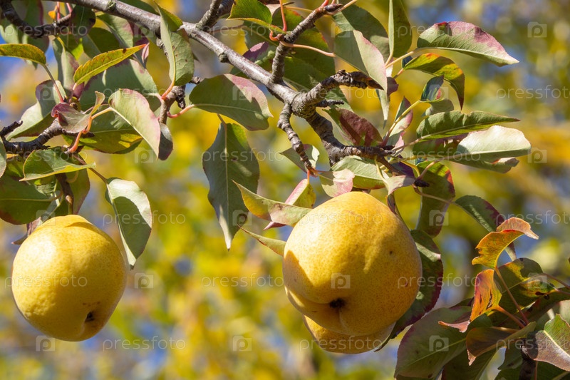 Свежие груши растут на ветке в саду под солнечным светом. Грушевое дерево со спелыми плодами. Органические фрукты. Спелые плоды груши крупным планом висят на ветке дерева. Урожай собирают осенью