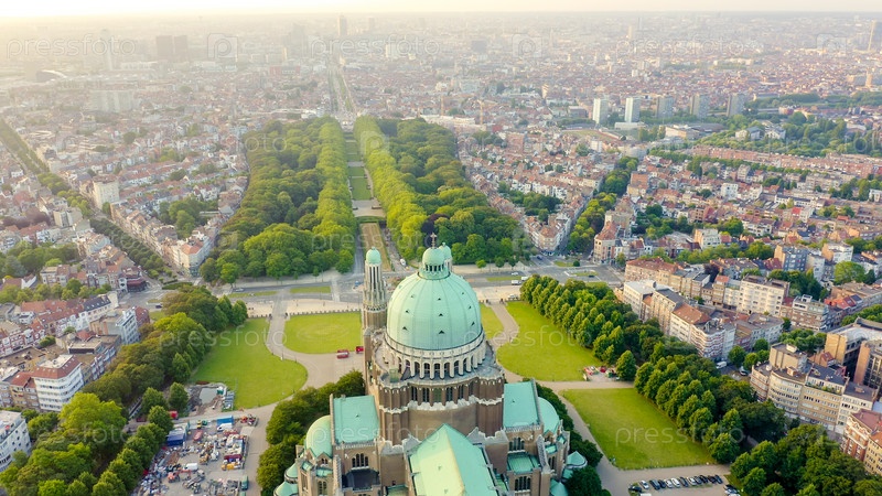 Брюссель, Бельгия. Национальная базилика Святого Сердца. Раннее утро, вид с воздуха