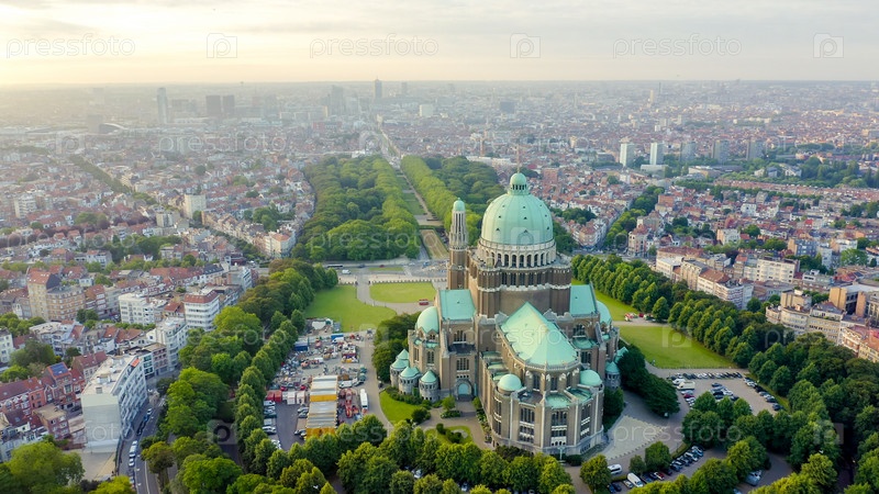Брюссель, Бельгия. Национальная базилика Святого Сердца. Раннее утро, вид с воздуха