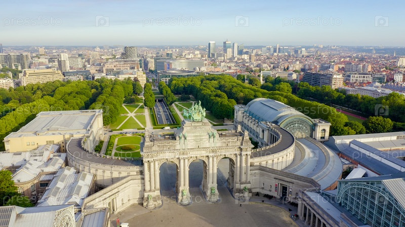 Брюссель, Бельгия. Парк Пятидесятилетия. Парк Сенкантонер. Триумфальная арка Брюсселя (Брюссельские ворота), вид с воздуха